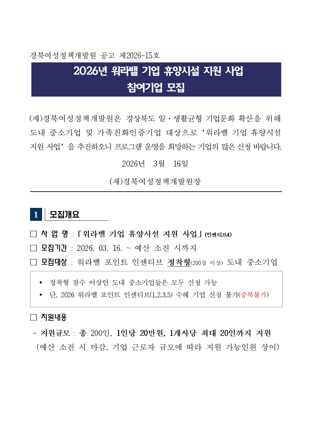 2026년 워라밸 기업 휴양시설 지원 사업 모집 공고